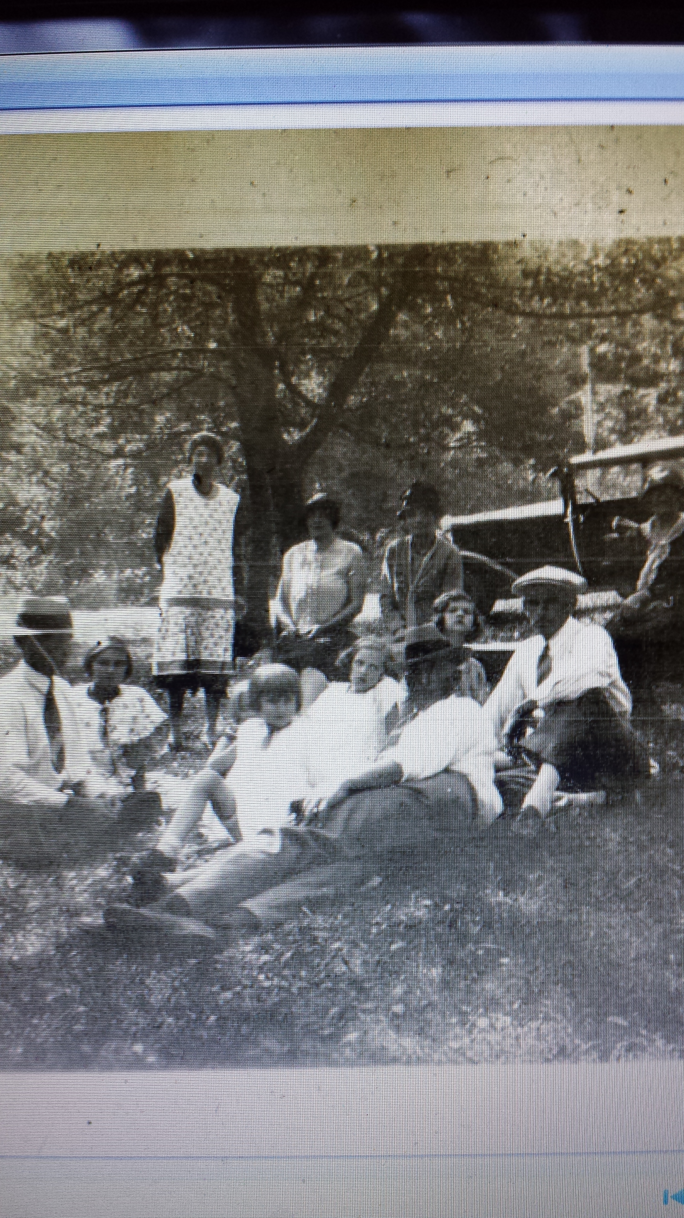 The car in this photo could be Old Hard Par. This was taken at one of the Meyer picnics. I can’t identify everyone but the Man laying in the grass with is his legs stretched out is my Grandfather, George H. Meyer. The little girl beside him on the left is my mother, Jeannette Meyer. I do not know about the little girl behind her, it could be her younger sister, Bunny Meyer. The girl sitting on the ground on the left side just behind the man is Gertrude Meyer another of my Mom’s sisters. Judging from the size of my Mom and the dresses on the ladies I would say this photo was probably taken around 1930-31.